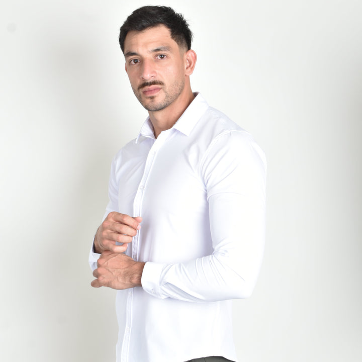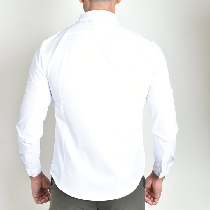 Esta camisa blanca de manga larga con cuello sport combina estilo y funcionalidad. Su tejido antifluidos protege contra manchas y salpicaduras, ideal para mantener una apariencia impecable durante todo el día. Perfecta para un look profesional y cómodo, ofrece resistencia y facilidad de cuidado, haciendo que sea una prenda indispensable en tu guardarropa.