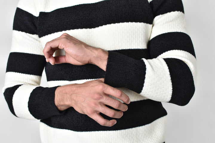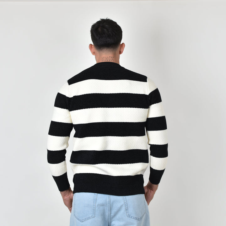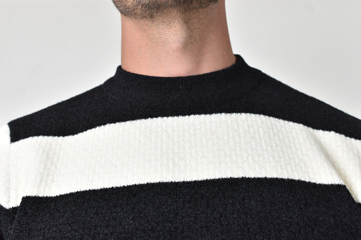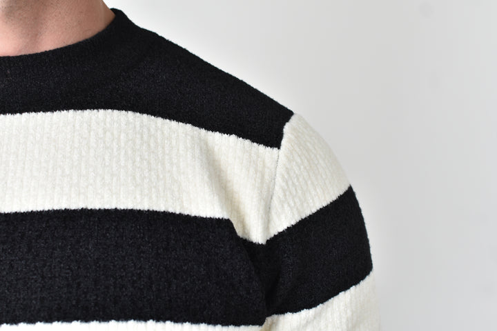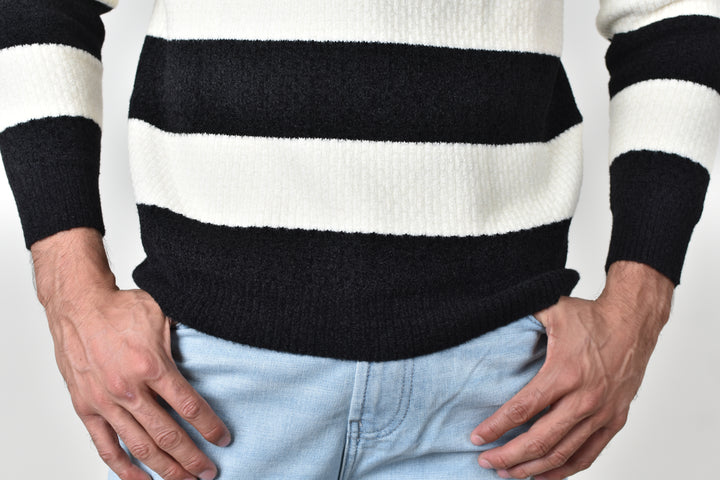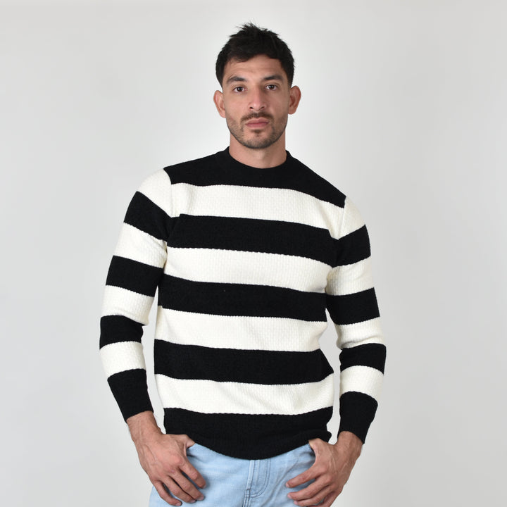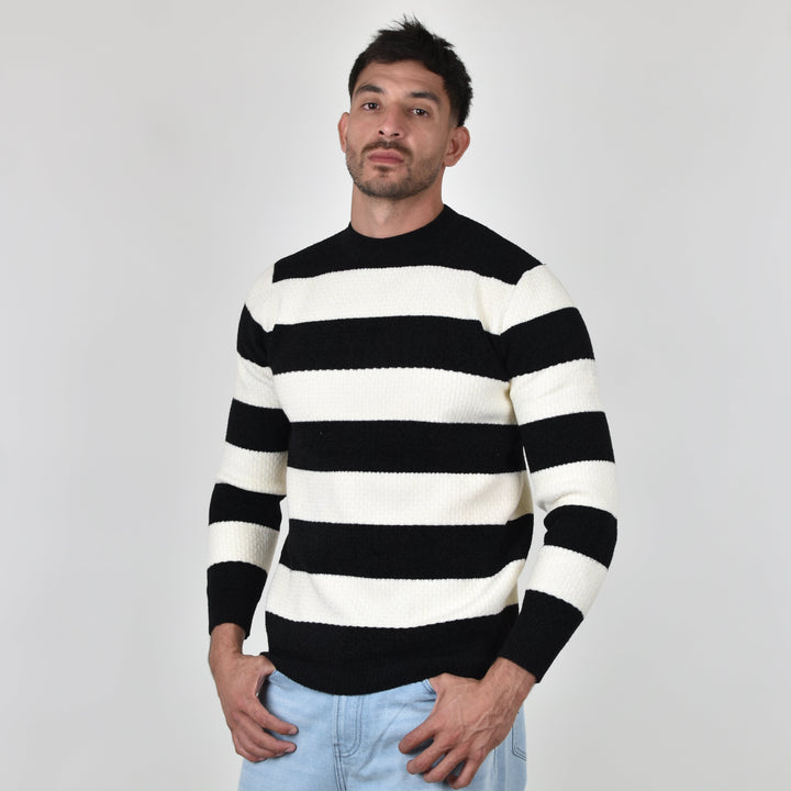 Suéter tejido en negro con un diseño de rayas anchas que combina estilo contemporáneo con comodidad excepcional. Confeccionado en materiales de calidad superior, este suéter ofrece calidez y versatilidad para cualquier ocasión. Las rayas horizontales crean un efecto visual dinámico que favorece la silueta, mientras que su textura tejida proporciona durabilidad y resistencia al uso frecuente. Perfecto para capas en climas frescos o como pieza central de tu outfit casual. Un básico imprescindible que trasciende tendencias y se adapta a tu guardarropa con facilidad.